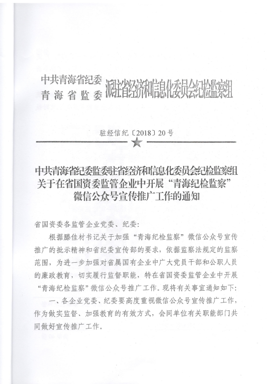 轉(zhuǎn)發(fā)《關(guān)于在省國資委監(jiān)管企業(yè)中開展“青海紀(jì)檢監(jiān)察”微信公眾號宣傳推廣工作》的通知